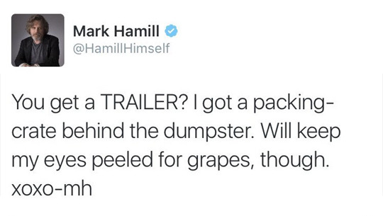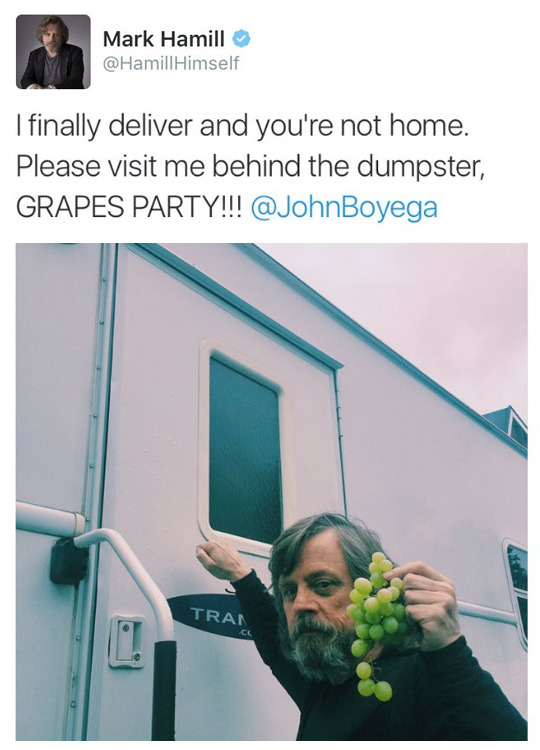 June 30, 2016 Overly Devoted Archivist Uncategorized awww, john boyega, mark hamill, star wars 0 Comments tastefullyoffensive: Star Wars Episode VIII: The Search For Grapes (via imgur) Share this: Share on X (Opens in new window) X Share on Facebook (Opens in new window) Facebook Like this:Like Loading...