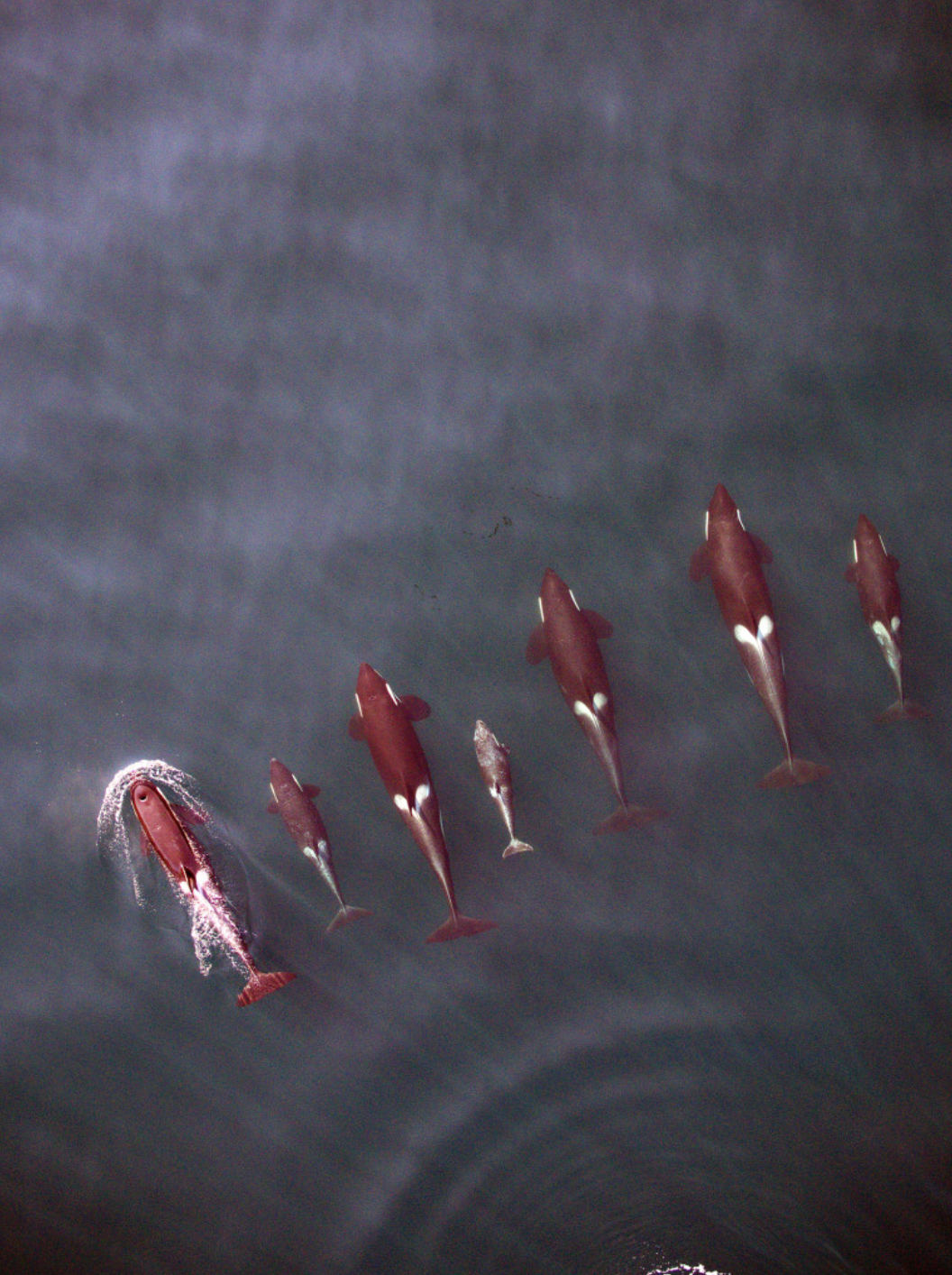Killer whales travel in their family group for most of their lives. This family group includes a two-year-old calf (second from top), and a young-of-the-year (middle).NOAA/Vancouver Aquarium