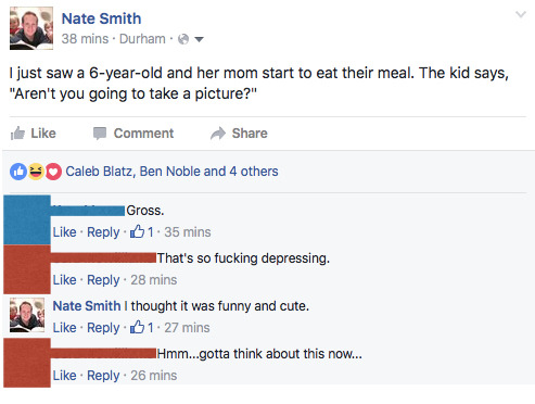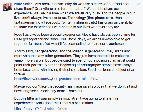 The concept of taking a picture of your food is not inherently bad. Social media is not inherently bad. Don’t shun your children, or anyone else, for doing something out of joy.