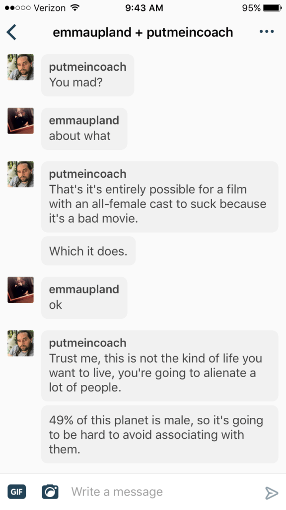 July 18, 2016 Overly Devoted Archivist Uncategorized 0 Comments acidinthesnow: emmaupland: I am amazed I love how she doesn’t even engage him and he still goes off as though she had literally spat in his face. Pick your battles, man This is completely horrifying.Share this: Share on X (Opens in new window) X Share on Facebook (Opens in new window) Facebook Like this:Like Loading...