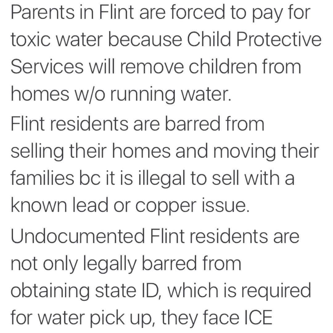 [text in image: Parents in Flint are forced to pay for toxic water because Child Protective Services will remove children from homes w/o running water.