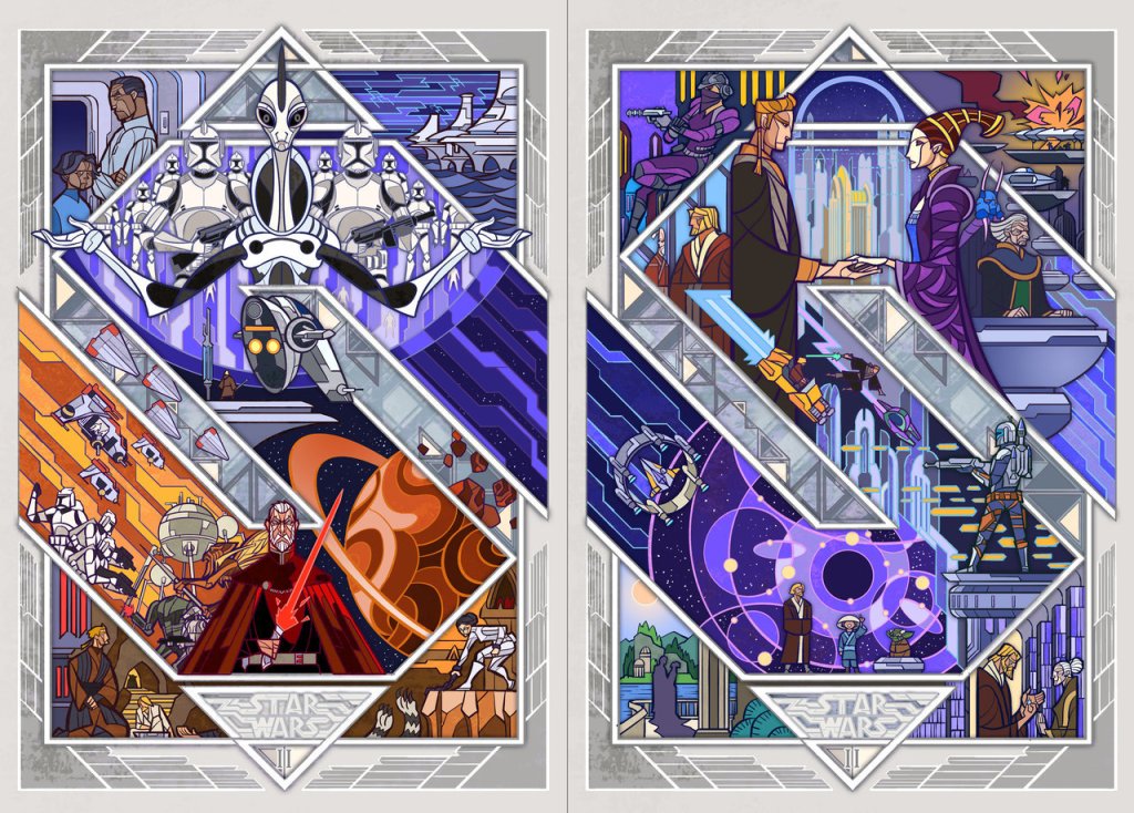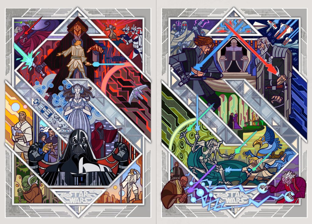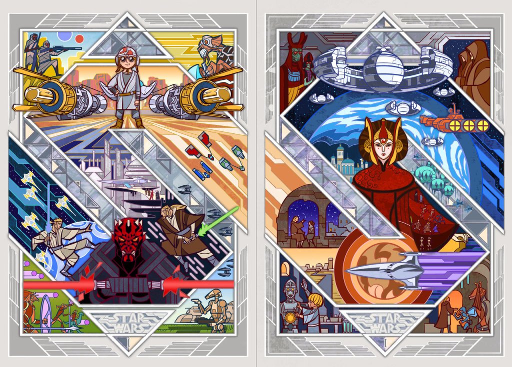 SWPAS just featured these STUNNING stain-glass Star Wars cover designs. According to breath-art (via Deviantart) who posted them, they’re the Chinese covers for the prequel novelizations. I think they’re wicked interpretations of the movies. All that visual narrative packed together, simplified on two pages for each film, It’s just my cup of tea!