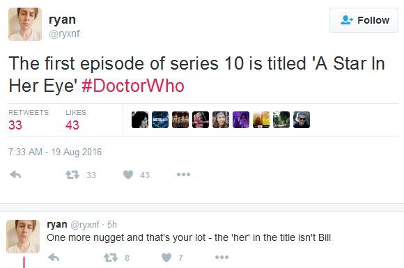 And of course the first thing this makes me think of is the “you were just a twinkle in your [parent]’s eye” idiom. Kindly excuse me while I sit under my rock and continue to make my Doctor + River + 24 years = Bill headcanons until broadcast when Moffat inevitably crushes my Time Tot dreams, thank you very much.