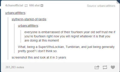 Hindsight is 20/20, I would literally push 14 year old me down a flight of stairs, have a nice day and please stop sending me snarky asks asking if I regret it yet bc yes I do thanks :)”man it would be kool if kids could just be kids. like, before reblogging somethin that boils down to “oh wow the criiinge!” just