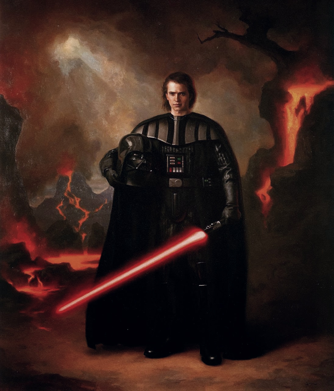 Oil painter Steven J. Levin says: “Vader … is the most interesting character to me, the central figure to the story, and a tortured one — the golden boy gone terribly wrong. The setting is Mustafar, the planet where Anakin sealed his own fate — where Vader was born. The thing that intrigued me about the Star Wars saga was the idea of the Jedi as protector knights and conversely of Darth Vader as a kind of dark knight.