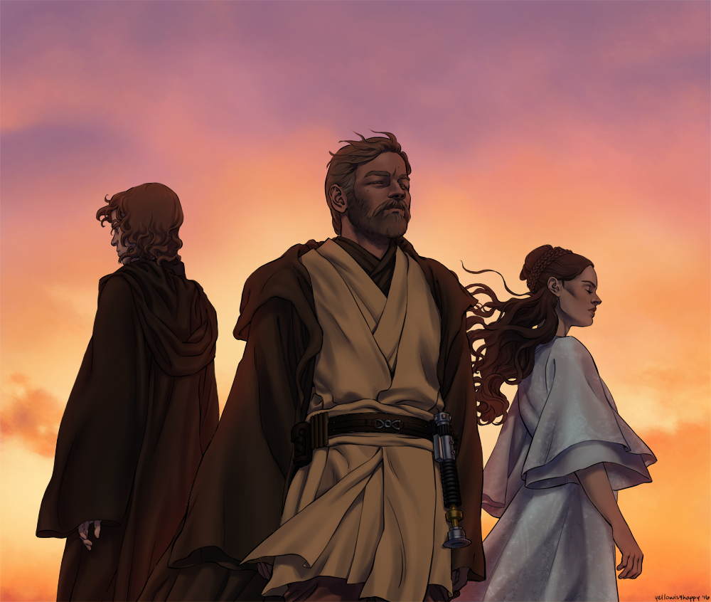 Jedi robes and lightsabers are hell to draw and I don’t know how the people on the official Star Wars comics do it month after month. Padmé’s dress was inspired by this beautiful Ashi Studio creation!