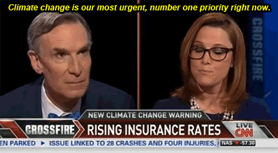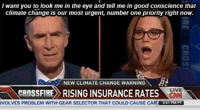 This Crossfire debate is actually a four way debate. There are two men, who aren’t shown in this gifset who are are worried about the economic toll of making America greener. This woman acknowledges that climate change is a problem, and is literally begging Bill Nye to say that climate change is our biggest problem and that politicians should focus more on preventing climate change. That’s what’s being shown in this gifset. Note how in the last gif she smiles and nods when Bill Nye takes her side. Right afterwards she says “That’s what I thought you’d say!” Stop mocking this woman because this quote was taken out of context.