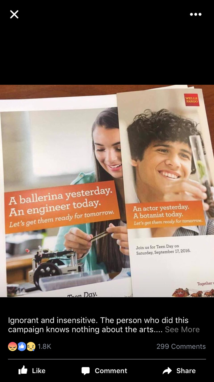 In addition to all the other good points on this, I want to point out that Wells Fargo would have had to pay a graphic designer to create this. How can they say the arts are impractical and unnecessary while they are paying someone for their design skills?