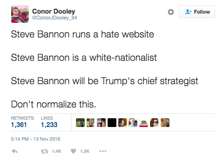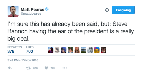 Donald Trump made one of the most significant initial choices regarding the composition of his future presidential administration choosing Republican National Committee chairman Reince Priebus as his future chief of staff and appointing former Breitbart chief executive Stephen Bannon as special counselor. Trump’s statement regarding the appointment is chilling.
