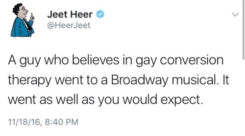 November 19, 2016 Overly Devoted Archivist Uncategorized 0 Comments not-so-tall-gay-danny: lilredk8monster: Mike Pence went to Hamilton tonight and the Audience boo’d him. Because FUCK Mike Pence for fucking ever. I can’t believe he had the nerve to show his face. The way the cast and audience responded was fucking perfect. Share this: Share on X (Opens in new window) X Share on Facebook (Opens in new window) Facebook Like this:Like Loading...