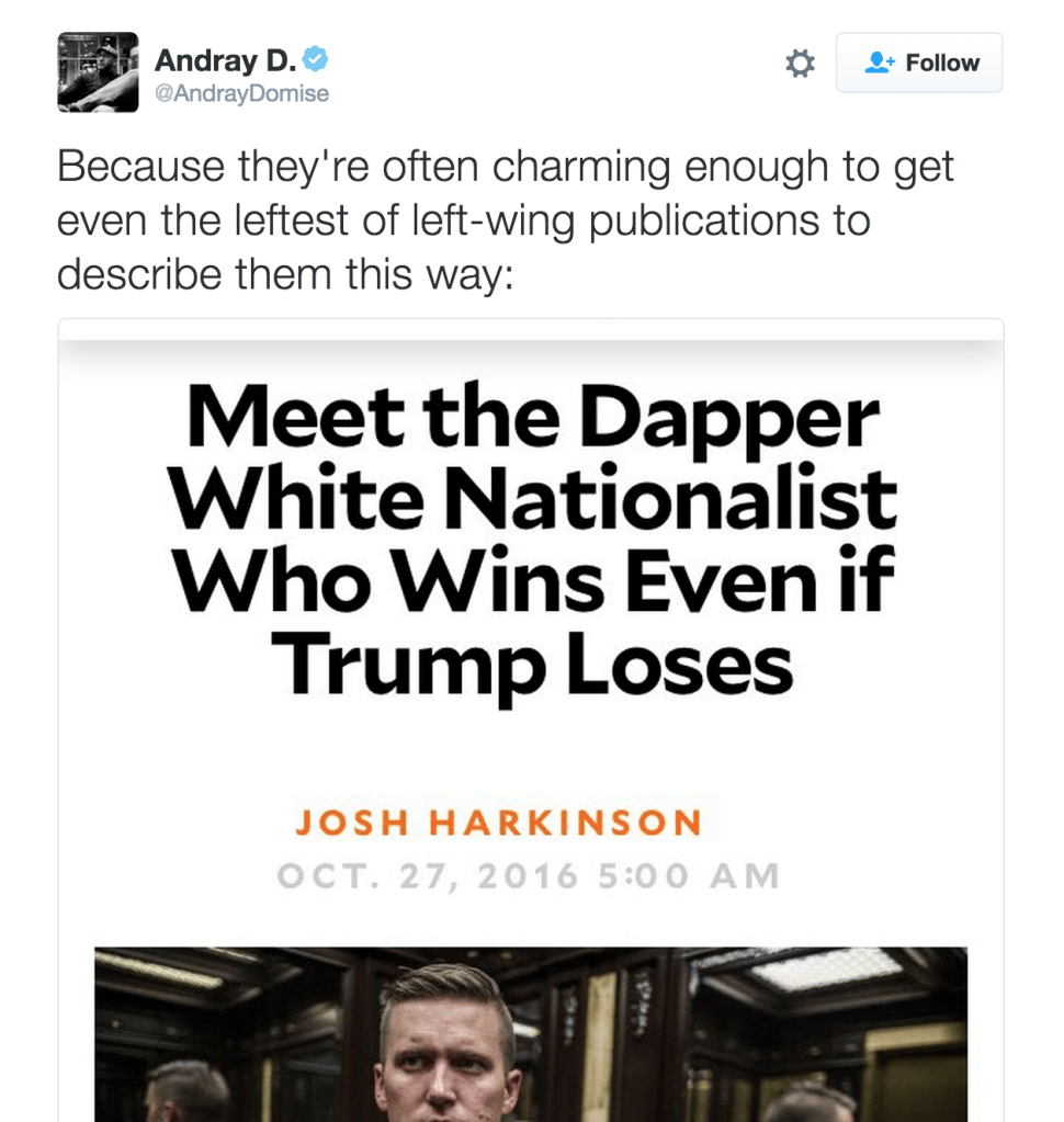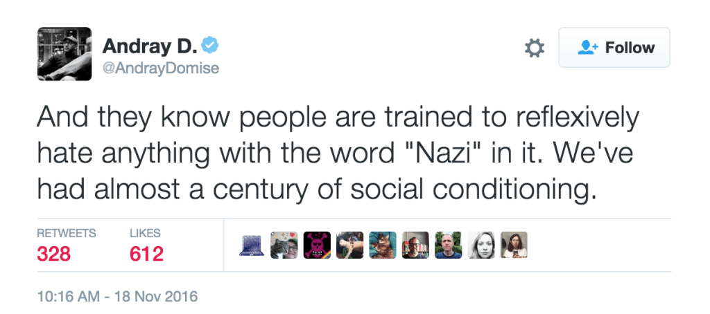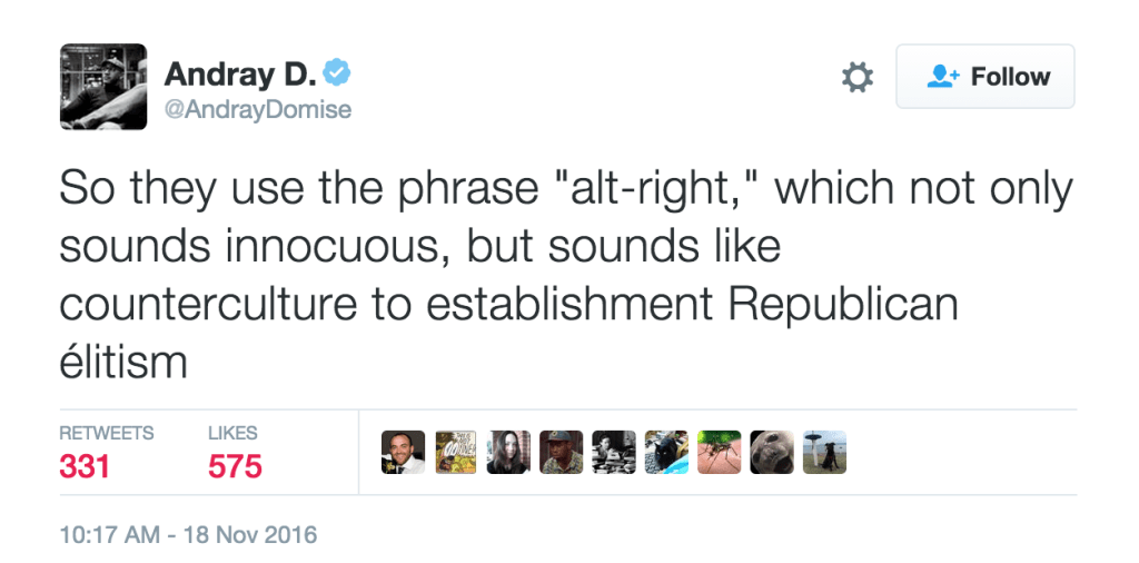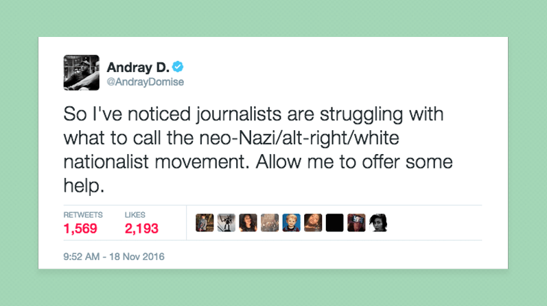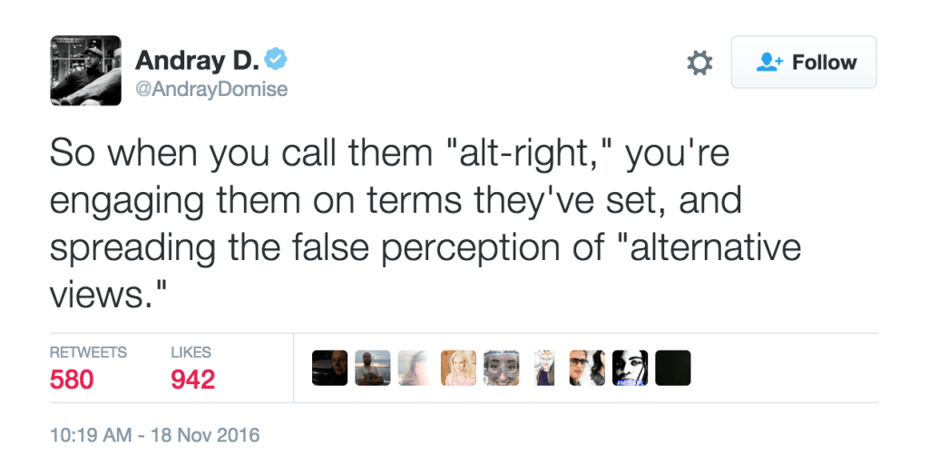 November 21, 2016 Overly Devoted Archivist Uncategorized 0 Comments mediamattersforamerica: The so-called “alt-right” are neo-Nazis by any other name, and that’s how the media should address them. Share this: Share on X (Opens in new window) X Share on Facebook (Opens in new window) Facebook Like this:Like Loading...