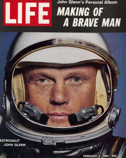 Glenn was a military man who flew 149 combat missions during the Korean War. In 1959, the year he posed for this portrait in a Mercury program pressure suit and helmet, he was announced as one of NASA’s original seven astronauts. Pictured here on the cover of the Feb. 2, 1962 cover – MAKING OF A BRAVE MAN. (Ralph Morse—The LIFE Picture Collection/Getty Images) #JohnGlenn