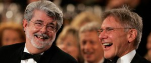 HOLLYWOOD – JUNE 09: Director George Lucas and actor Harrison Ford react in the audience during the 33rd AFI Life Achievement Award tribute to George Lucas at the Kodak Theatre on June 9, 2005 in Hollywood, California. (Photo by Vince Bucci/Getty Images)