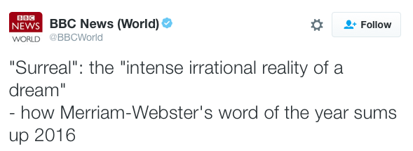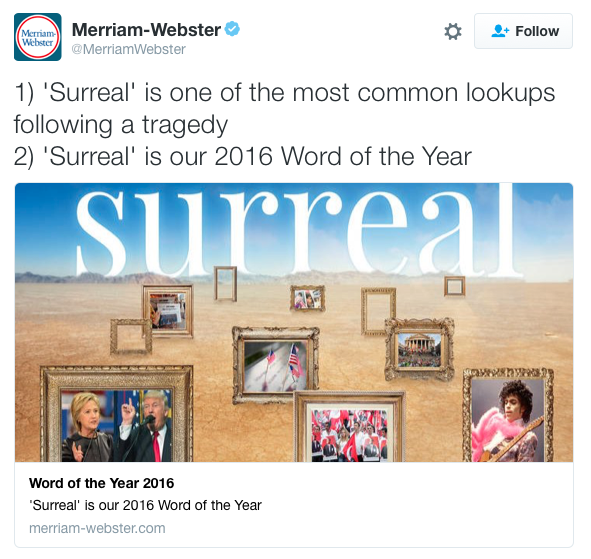 - Merriam-Webster has chosen “surreal” as its 2016 word of the year and this feels extremely, unfortunately right.