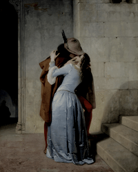 “In this hug and this kiss, the audience foresees the pain for an imminent and inevitable departure: after the heartbreaking goodbye, the youg lady will be left alone, full of nostalgia, wallowing herself in her melancholic wait, overcome with the dread of never seeing her beloved again.” (Giuseppe Nifosì)