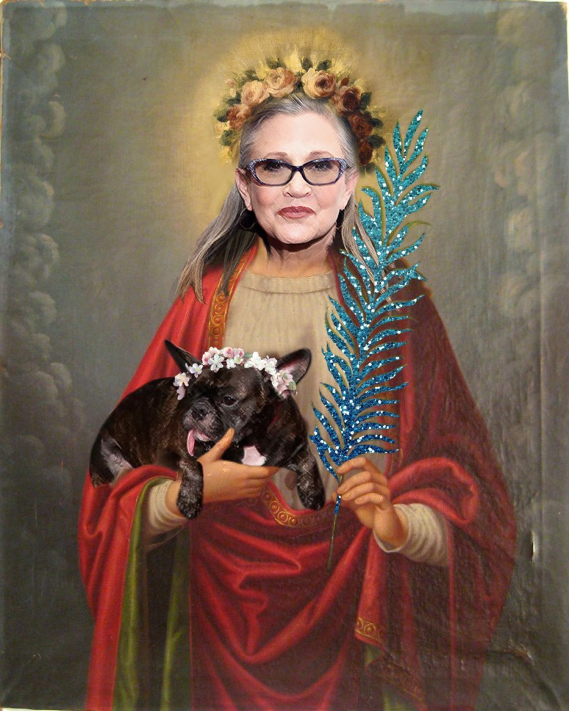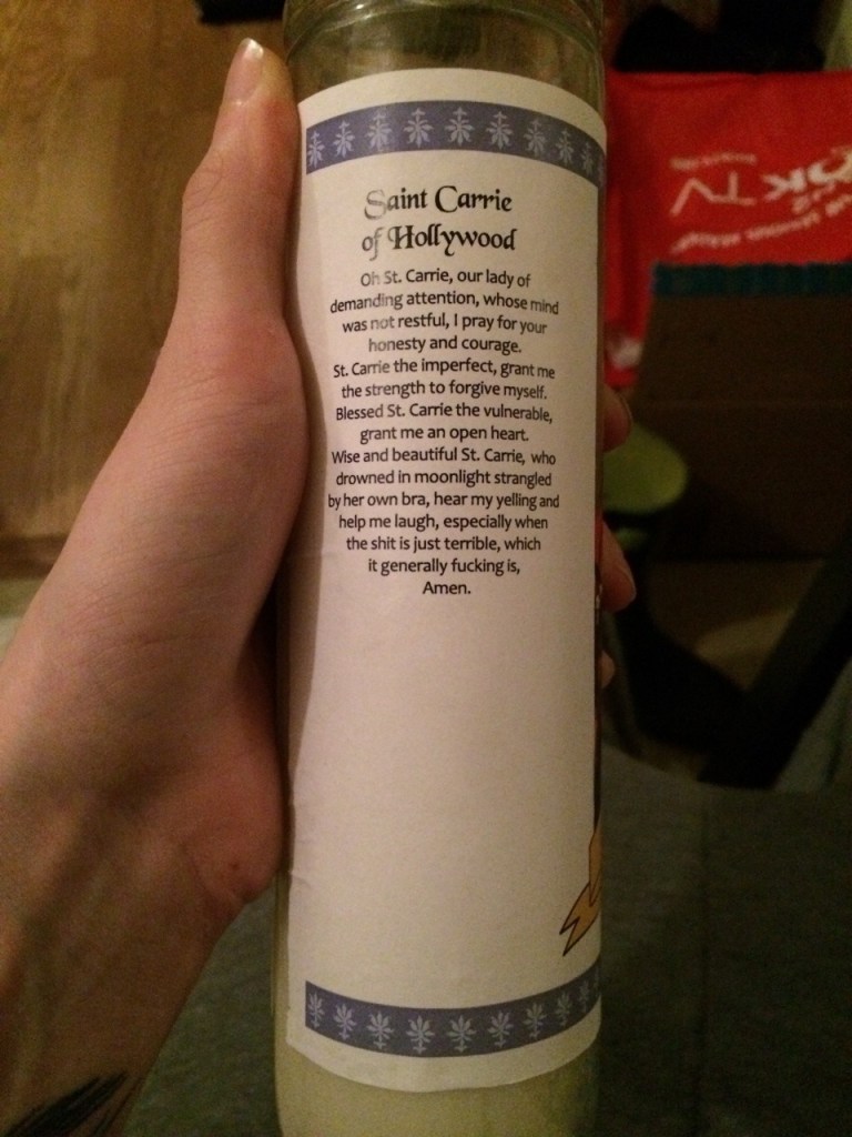 Design is available here! Just print out on 8.5×11″ paper, cut along the gray lines, paint the back of the paper with craft glue (i used Mod Podge) and wrap it around a plain glass pillar candle. Voila: your very own secular and/or idolatrous Space Mom candle! Please remember that Carrie Fisher’s dad was Jewish every time you look at it, cause, you know.