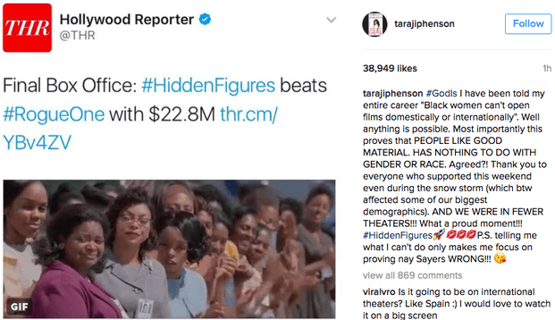 - And most of all, as star Taraji P. Henson noted on Instagram, it again proves movies about women and people of color make money. Read more
