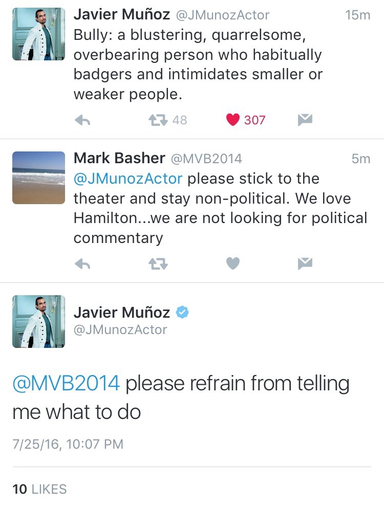 I just want to pause a moment to appreciate that “we love Hamilton … we are not looking for political commentary” is an actual sentence that someone typed.