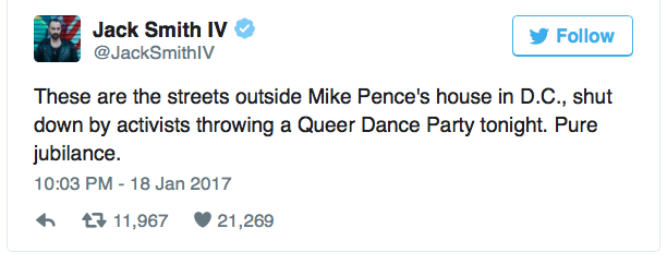 January 19, 2017 Overly Devoted Archivist Uncategorized I hope they kept him awake 0 Comments micdotcom: Protesters held an LGBTQ dance party last night outside of Mike Pence’s home in DC Share this: Share on X (Opens in new window) X Share on Facebook (Opens in new window) Facebook Like this:Like Loading...