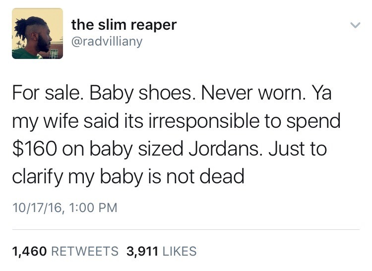 February 7, 2017 Overly Devoted Archivist Uncategorized heh 0 Comments deanplease: In case any of you don’t know, “For Sale. Baby shoes. Never worn.” is long famous as being “a six-word novel,” and is attributed to Ernest Hemingway. This Tweet is a brilliant twist on that classic. Share this: Share on X (Opens in new window) X Share on Facebook (Opens in new window) Facebook Like this:Like Loading...
