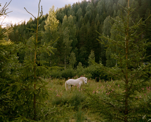 It was the end of the second day of cycling, about 200 km in. I had just had a large hamburger with fries at a gas station and was making my way up a valley at sunset, when I noticed this white horse standing in a meadow, like something out of a fairy tale.