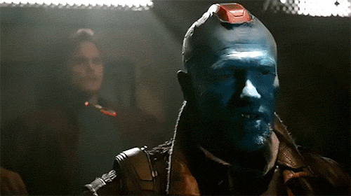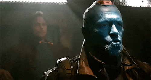 There’s a recent interview with James Gunn in which he says that the Peter-Yondu relationship in the second movie is set up in the first movie (people ask him if he introduced it in the second movie, and he says no, it’s all there in the first movie if you look for it) and this scene is one of the scenes where it really shows. I had to gif Yondu’s expressions in detail because there’s just so much there.