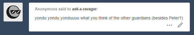 June 12, 2017 Overly Devoted Archivist Uncategorized guardians of the galaxy, omg i love this 0 Comments ask-a-ravager: Kraglin: sir, please, if you sign any more adoption papers you’ll give yourself carpal tunnel Share this: Share on X (Opens in new window) X Share on Facebook (Opens in new window) Facebook Like this:Like Loading...