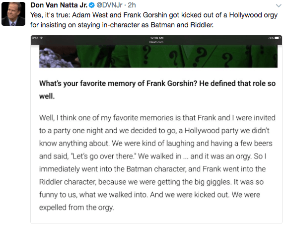 June 13, 2017 Overly Devoted Archivist Uncategorized oh my gosh 0 Comments thpock: can you IMAGINE seeing adam west walk into an orgy and just start Being Batman… holy shit Share this: Share on X (Opens in new window) X Share on Facebook (Opens in new window) Facebook Like this:Like Loading...