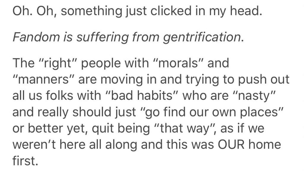 September 6, 2017 Overly Devoted Archivist Uncategorized 0 Comments susiethemoderator: lipglosspaige: Now just what in the HELL did I just read When I wrote a post about toxic masculinity in the Guardians of the Galaxy movies, I got it reblogged by someone calling it “fandom gentrification” (and me some names) Wonder if this is the same people…Share this: Share on X (Opens in new window) X Share on Facebook (Opens in new window) Facebook Like this:Like Loading...