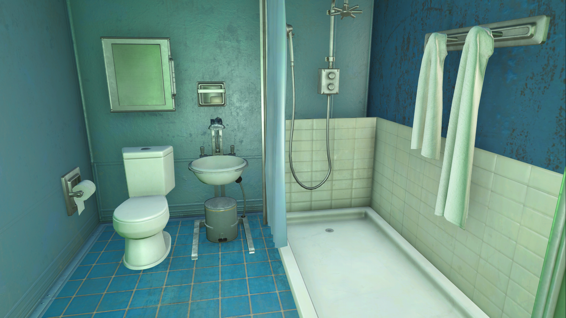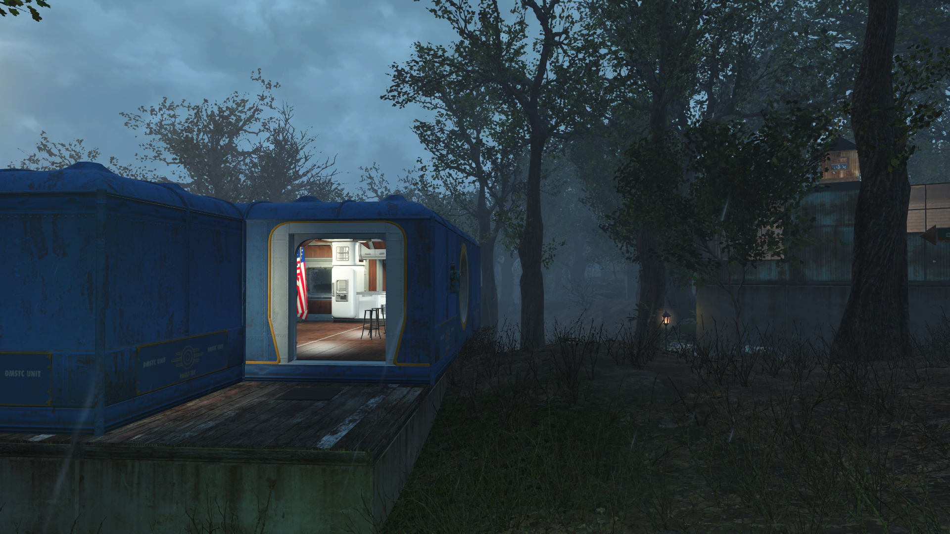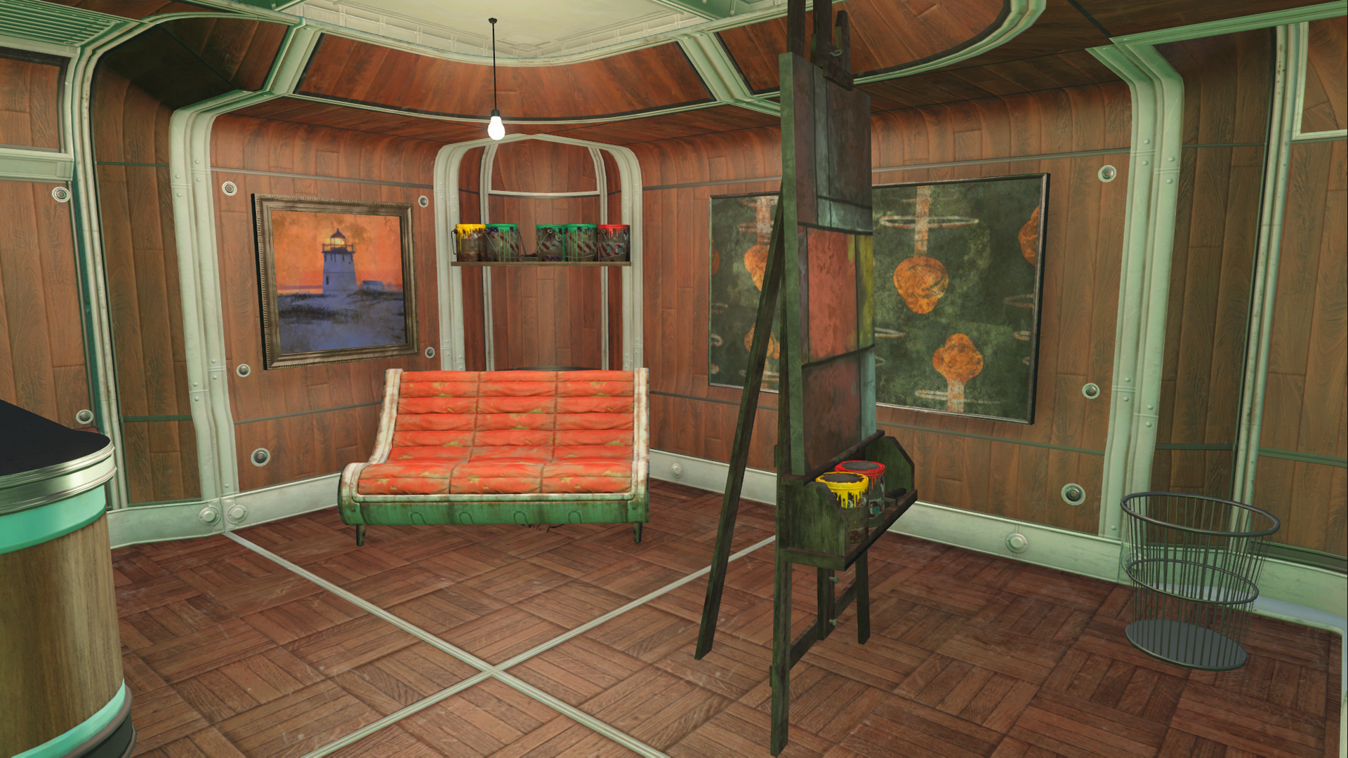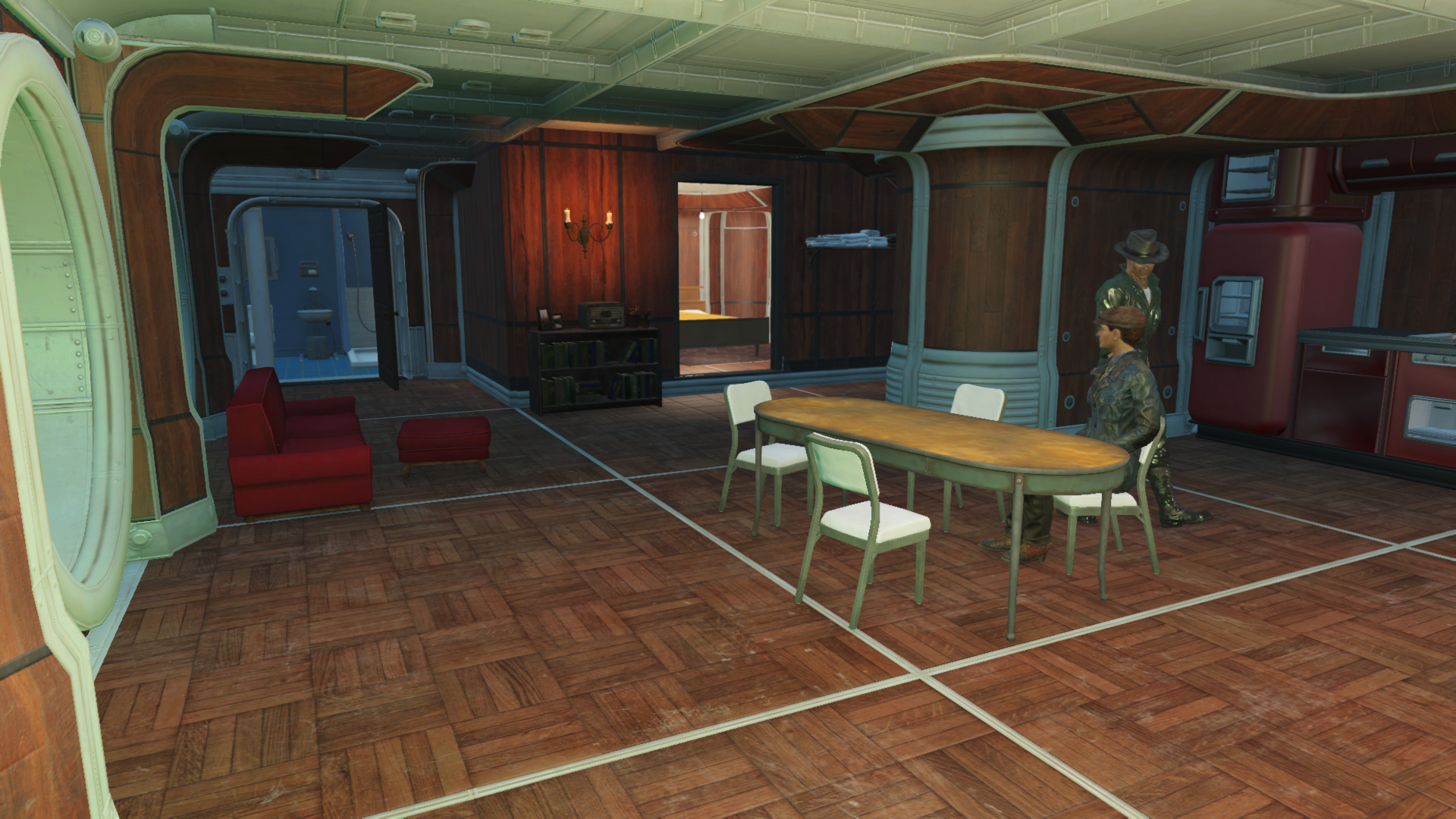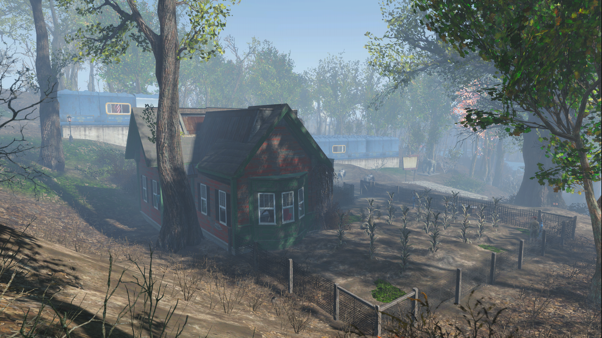 Okay, to the left of the police station there’s a house, constructed from salvaged Vault parts as many houses are…