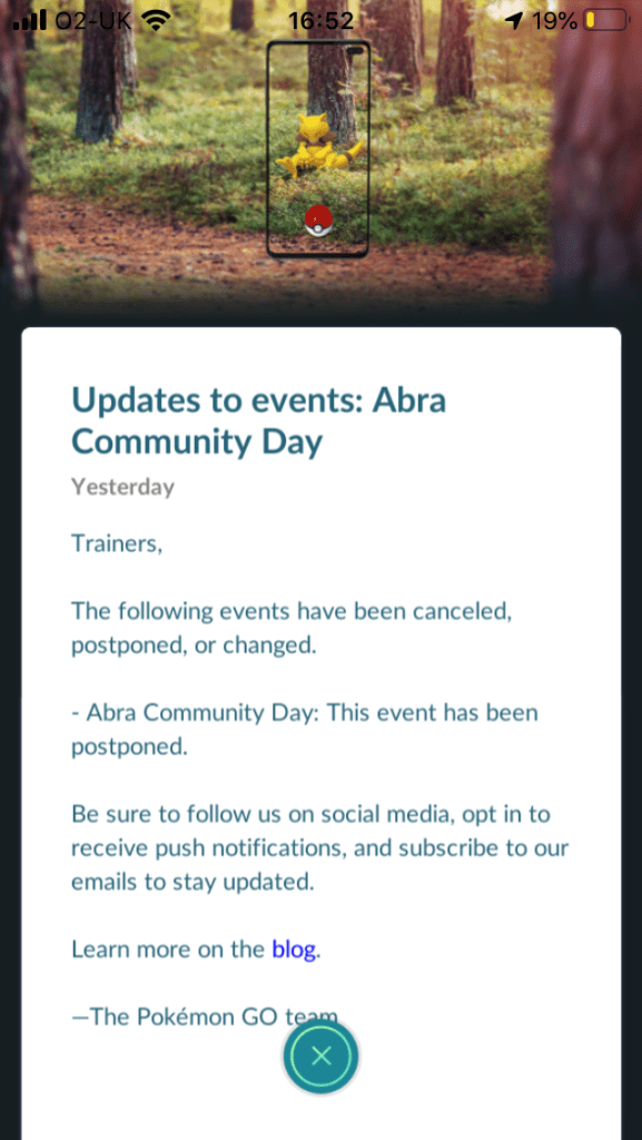 March 13, 2020 Abra Community Day got cancelled Overly Devoted Archivist Uncategorized pokemon, pokemon go 0 Comments Ironically, I missed the last Community Day because of… a virus. Share this: Share on X (Opens in new window) X Share on Facebook (Opens in new window) Facebook Like this:Like Loading...