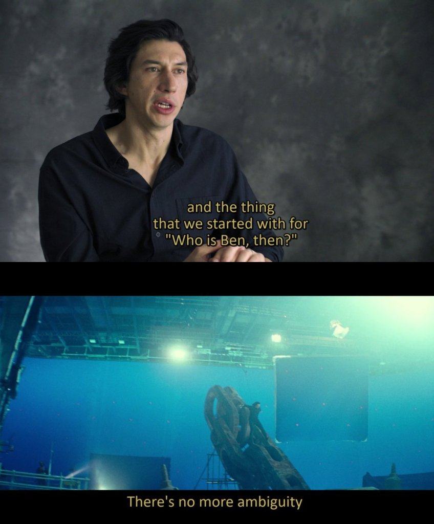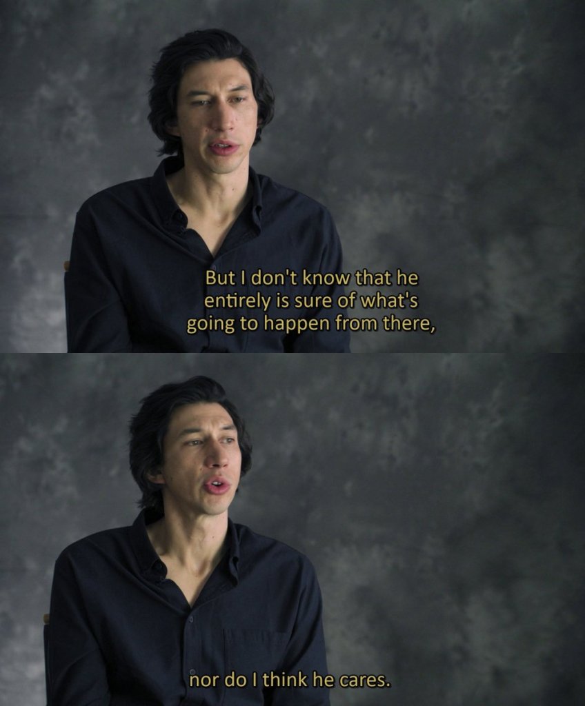 What I mean by that is, in the comics, Ben cites that the weight of legacy drove him to many of his decisions, but even within the comic itself, he contradicts that and, when listening to Driver talk about the character, it’s not mentioned at all.  Oh, I have no doubt it was a factor of Ben’s choices, but it wasn’t the actual problem–the problem was that he never knew what he was supposed to do, what path he was supposed to be on, and he never really did the hard look into himself to figure that out.