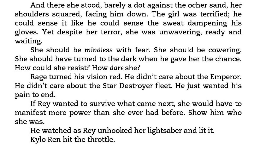 So I actually really loved what the novelization presents as his reasons for wanting to turn Rey, why he wants to bring her to the dark side.  That it’s justification for his latest careening choice, that he’s still see-sawing at that point, it’s ambiguous what he’s supposed to do, and even during the fight on Pasaana, he has no idea what that is.