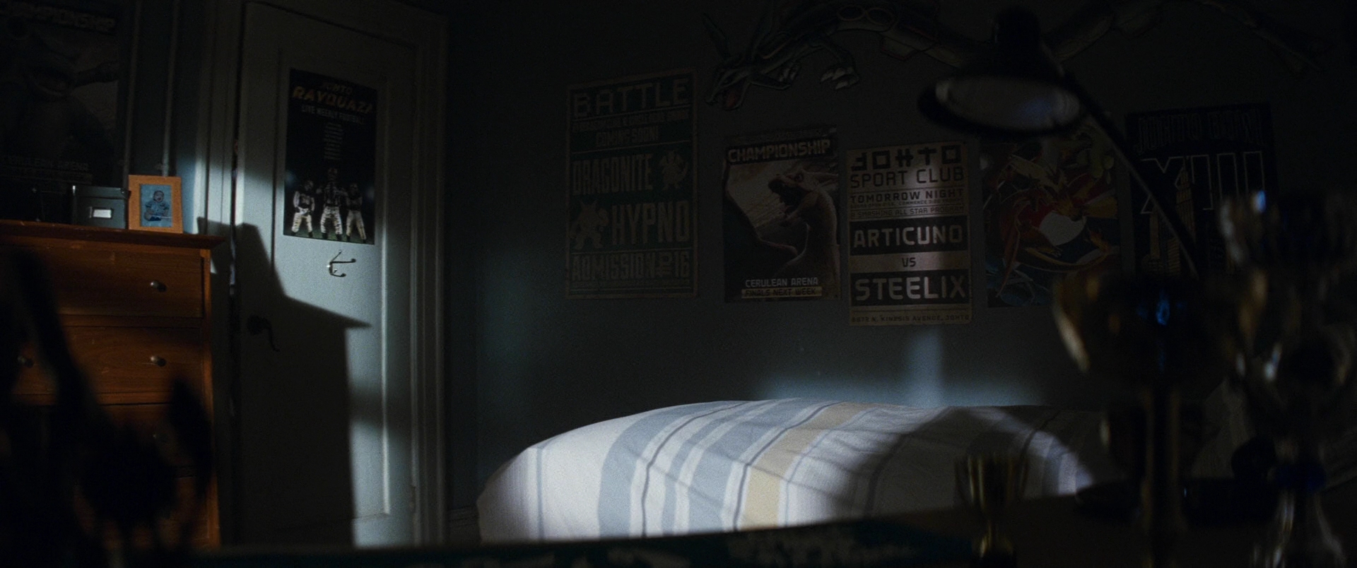 Some of the place names on the posters (Cerulean, Johto) will no doubt be familiar to Pokemon fans… also why does someone have an Articuno in battle, they’re meant to be legendary