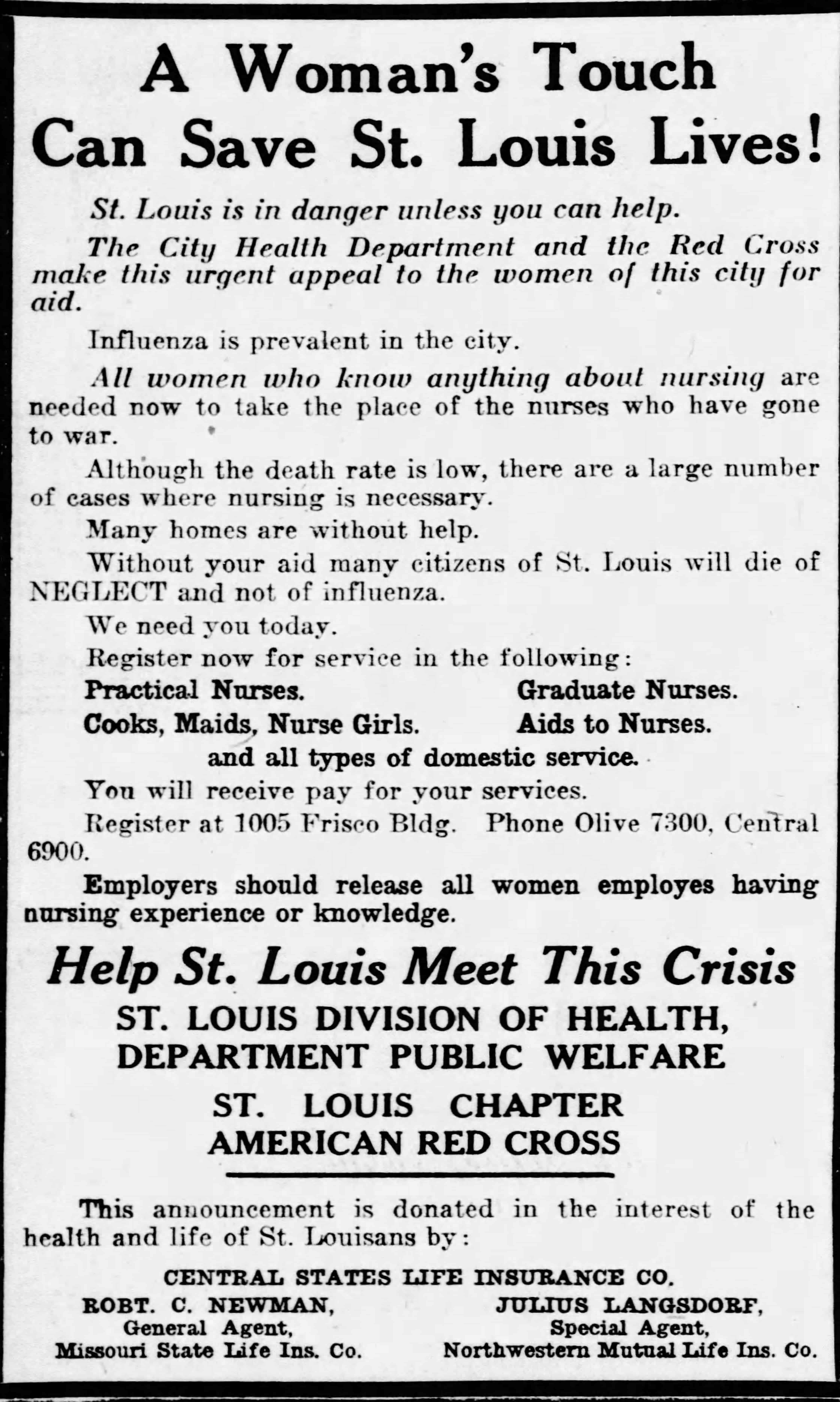 A Woman’s Touch Can Save St. Louis Lives! — 1918 Ad Pleading for Nurses, Cooks, and Maids — Making Histolines