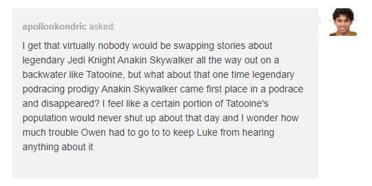 Owen, Beru, and Luke also live fairly far away from Mos Espa, where the podrace took place (I think it’s something like 300km/180 miles away), as well as it happened quite some time ago, so it wouldn’t have been too hard to keep that info from Luke if they were careful or if the Hutts covered it up, but it would be interesting if Luke ever went to Mos Espa (though, that’s doubtful, the Larses went to Anchorhead to get their supplies, they probably knew to stay away from Mos Espa if they didn’t want to tell Luke about Anakin), but it would be an absolutely fascinating thing to explore, just how much cultural impact a human winning the race like that would have, if Anakin’s name was known on Tatooine after that or if it was covered up because nobody wanted anyone else getting any big ideas.