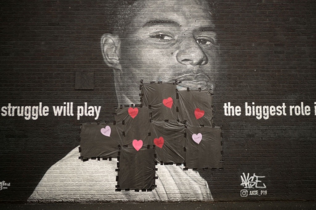 MANCHESTER, ENGLAND – JULY 12: Love hearts and slogans, placed by a local resident, are stuck on the plastic that covers offensive graffiti on the vandalised mural of Manchester United striker and England player Marcus Rashford on the wall of a cafe on Copson Street, Withington on July 12, 2021 in Manchester, England. Rashford and other Black players on England’s national football team have been the target of racist abuse, largely on social media, after the team’s loss to Italy in the UEFA European Football Championship last night. England manager Gareth Southgate, Prime Minister Boris Johnson, and the Football Association have issued statements condemning the abuse. (Photo by Christopher Furlong/Getty Images)