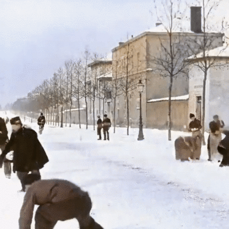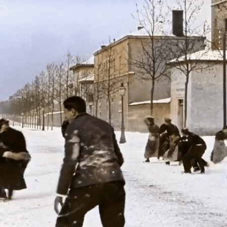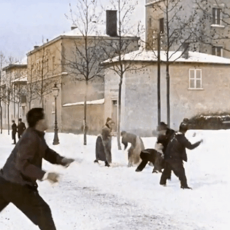 Snowball fight 124 years ago. Lyon, France, 1896. Colorized and speed adjusted. Original in black and white by Louis Lumiere.