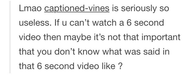 y’know its not like HoH or Deaf, or maybe non-native english speakers watch vines or anything….just a thought….. (BTW Captioned-vines, you’re great, keep doing what you do)