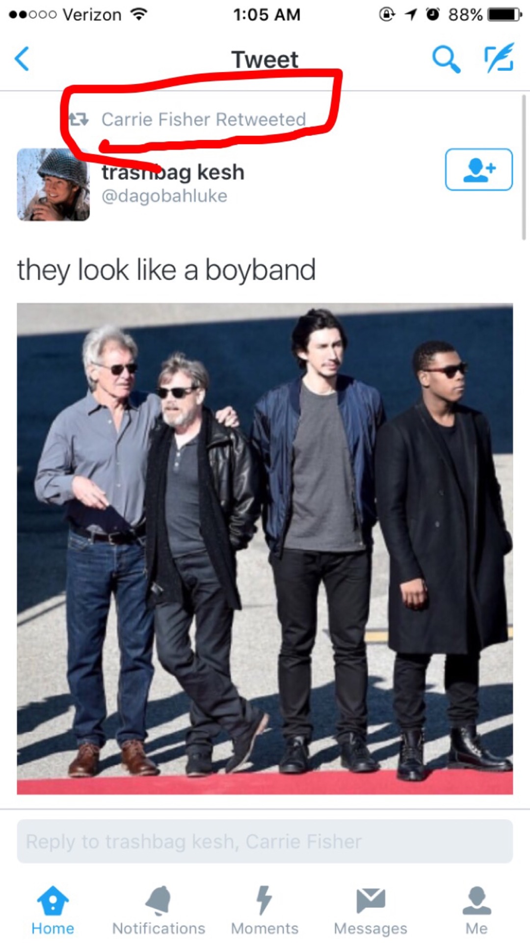 January 11, 2016 Overly Devoted Archivist Uncategorized adam driver, carrie fisher, harrison ford, john boyega, mark hamill, world's best boy band 0 Comments adamdrivr: Carrie is a QUEEN