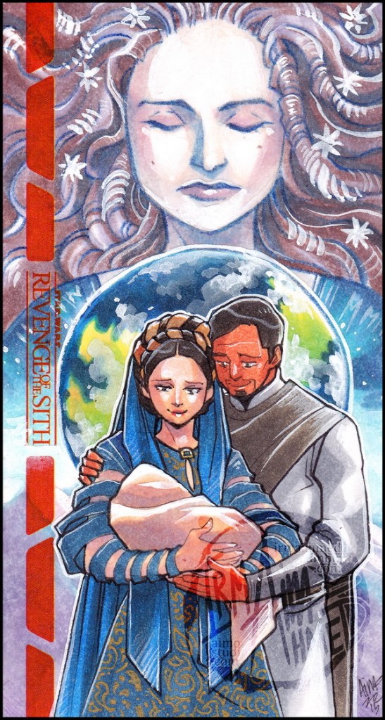 Individual pieces depicting the ending of Revenge of the Sith, with Padme & Anakin’s children in the arms of their respective adoptive parents.