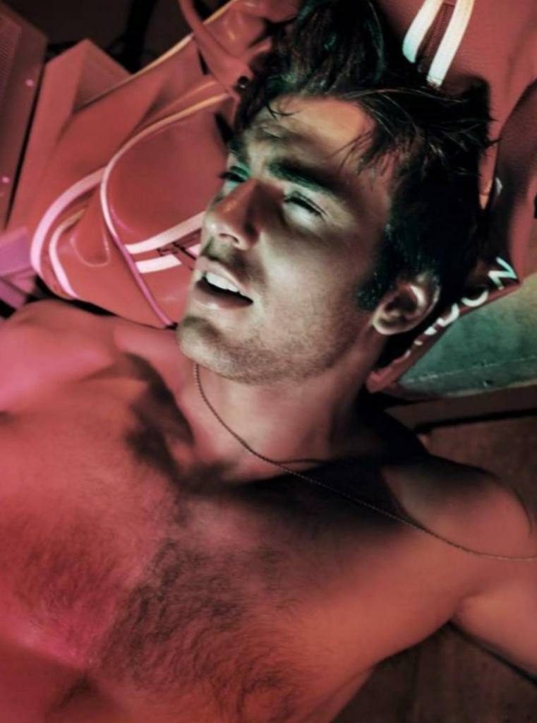 Most photos of a beefy blonde male have him staring aggressively. You know the type I mean – stance wide and shoulders spread, eyes lit with challenge, as if he’s about to punch or fuck the camera man. This set is the exact opposite. Evans glances away from the camera like a Victoria’s Secret model, or else peeks from behind a shirt like he’s asking for approval. The photos where he’s on his knees have his spine curved to show off his slender waist, elbows in to show submission. Heck, in one picture the curve of his torso mirrors the curve of the lady on the poster in the background.