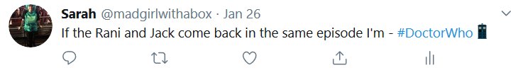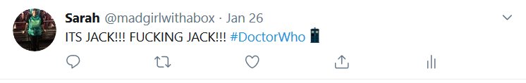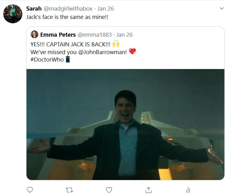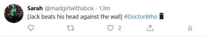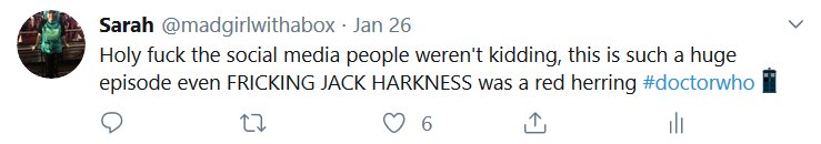 So, uh… I was right on one count? But then. But THEN! The appearance of Captain Jack frickin’ Harkness turned out to be merely a red herring for the REAL plot of the episode. My god! There was a past Doctor our Doctor doesn’t even know about. And she was a black woman. This episode is arguably the most important episode Doctor Who has ever produced, and I’m so glad I got to see it live. I’d never even heard of Jo Martin before this episode, but seeing “Jo Martin as The Doctor” in the end credits blew my mind. How’d they keep all this under wraps?! Wow.