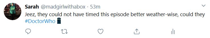 I’m ill, proper ill (sigh) and I wasn’t expecting to enjoy Doctor Who tonight because it’s hard to enjoy anything, but it turned out to be a fun rollercoaster ride in the end. And extremely well-timed to the weather, what are the odds.