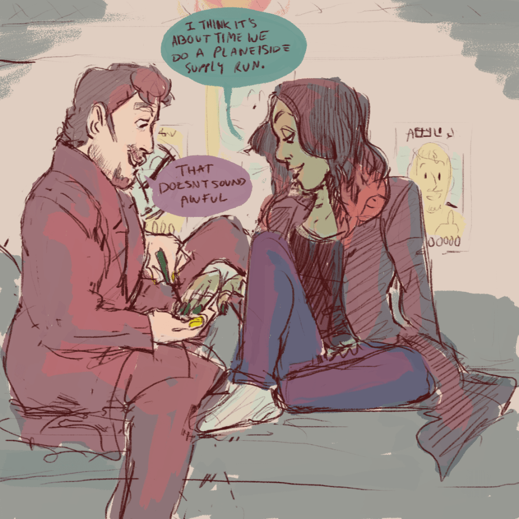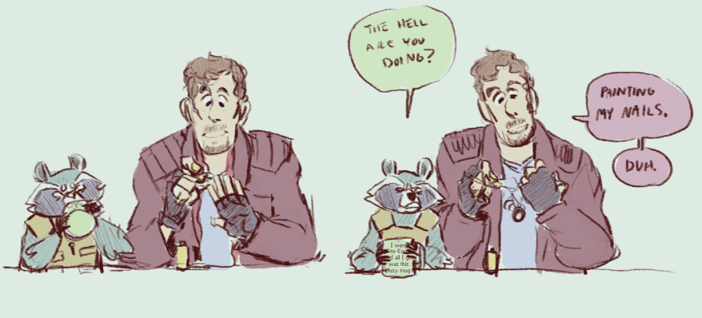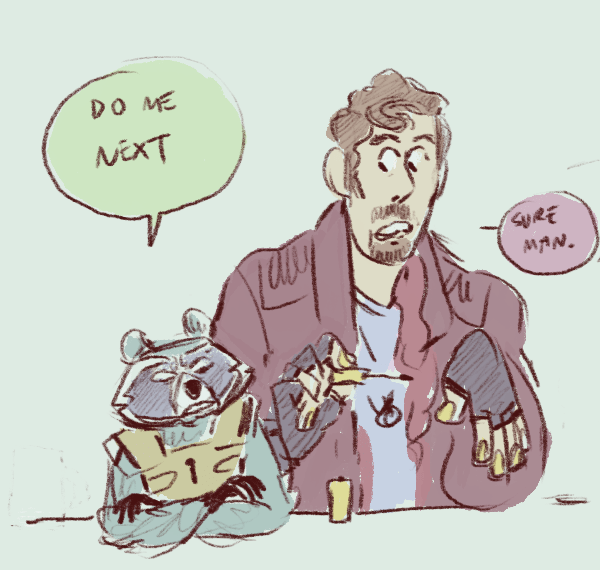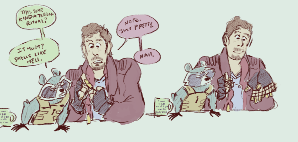 dumping some draws before i head out on a roadtrip! i got a request for rocket getting petted a while ago and kind of… went to town. also, poor kraglin didn’t make the cut for rocket’s drawings of his friends on the gotg ride at disney. also also star-lord’s scarf is cute