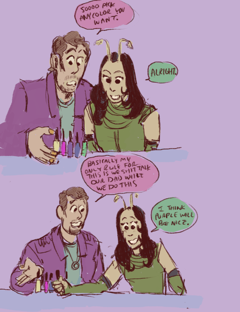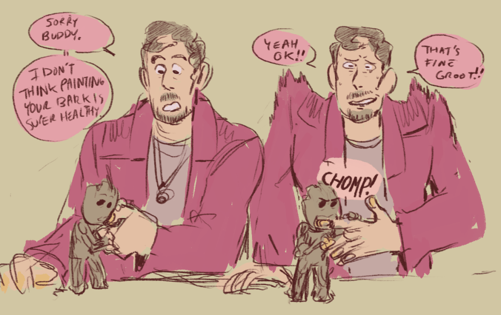 a very sacred terran ritual. also, if something’s small and colorful, groot thinks it’s a bug, and he WILL try to eat it (and starlord will be too much of a dad to do anything about it)