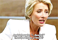 God, I love Emma Thompson! This particular trope is rooted in the idea that, whereas men have a strong, mature sense of morality in the abstract, and therefore act selflessly for the greater good, women are childlike and incapable of higher-order moral abstraction, and therefore care only for what affects them personally. (Yes, I read Carol Gilligan in college and it made a big impression.)