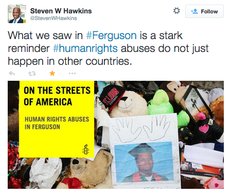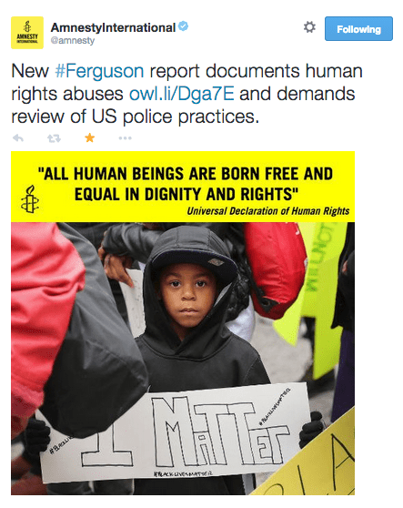 Amnesty said it sent a delegation to Ferguson from Aug. 14-22 to monitor the situation.