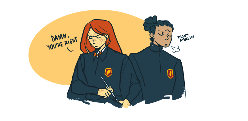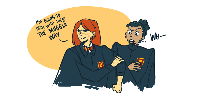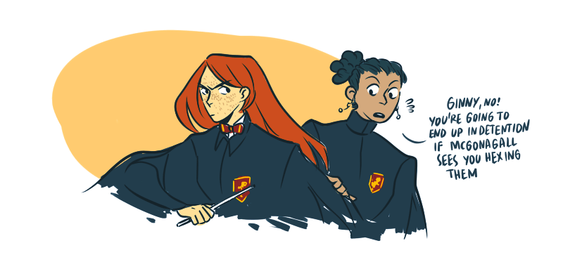‘Come on, Ginny’s not bad,’ said George fairly, sitting down next to Fred. ‘Actually, I dunno how she got so good, seeing how we never let her play with us.’