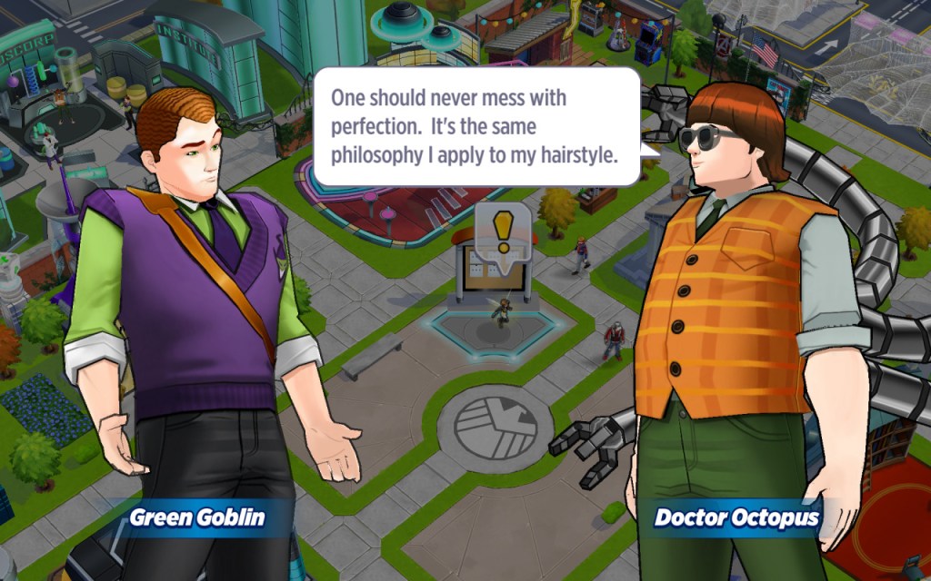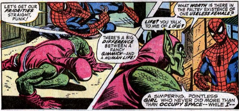 So it is perhaps inevitable that Spider-Man’s greatest enemy, the Green Goblin, will pop up at some point. Lemme tell you about him. GG is much more frightening when he’s Norman Osborn. Norman Osborn is a power-hungry abusive misogynist with weird hair, almost like… you know… someone else. (Yes, Marvel really did kindasorta call it. It’d be funny if it wasn’t so depressing.) Woman-hating is built into his character, and was ever since he threw Gwen Stacy off that bridge.